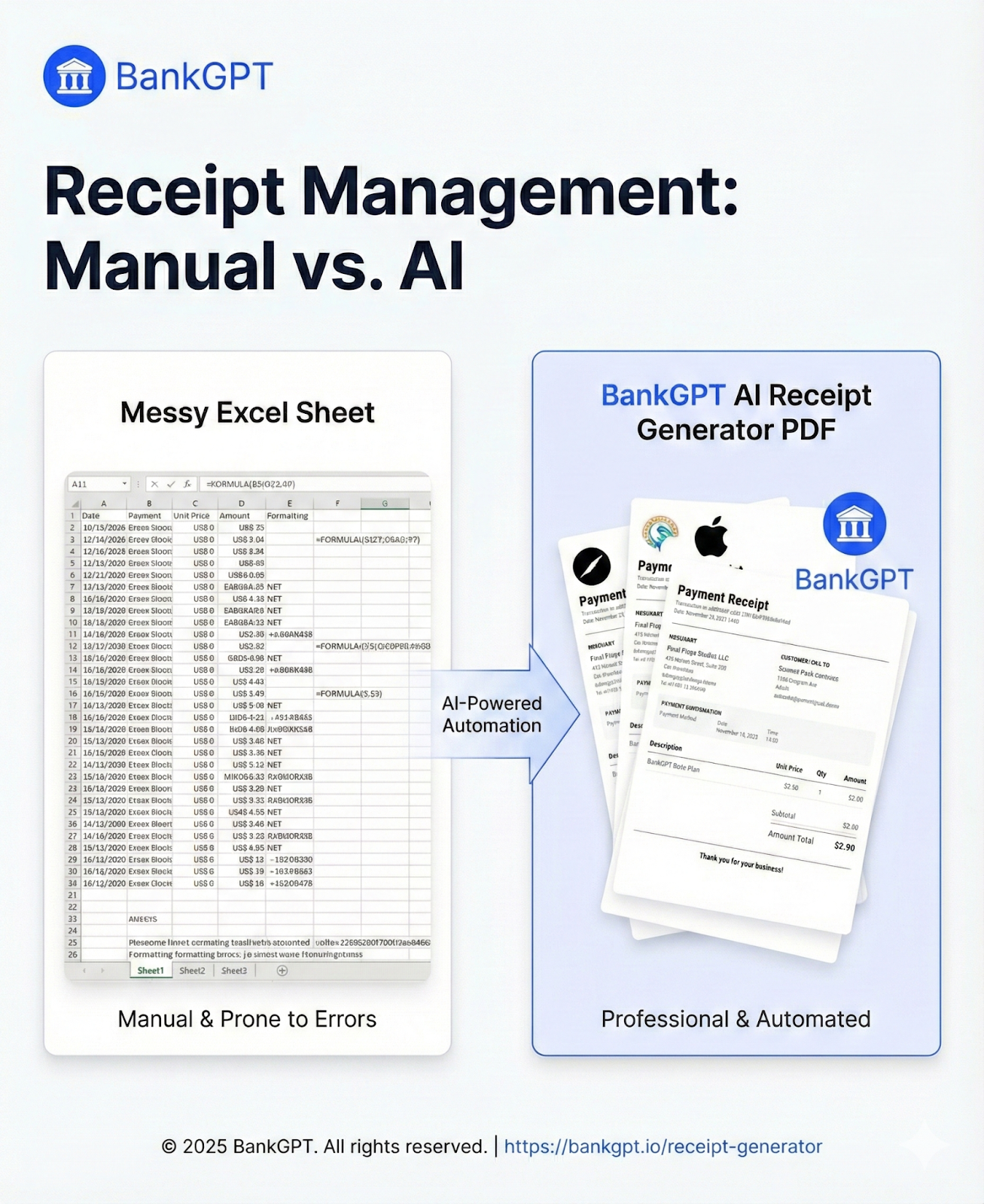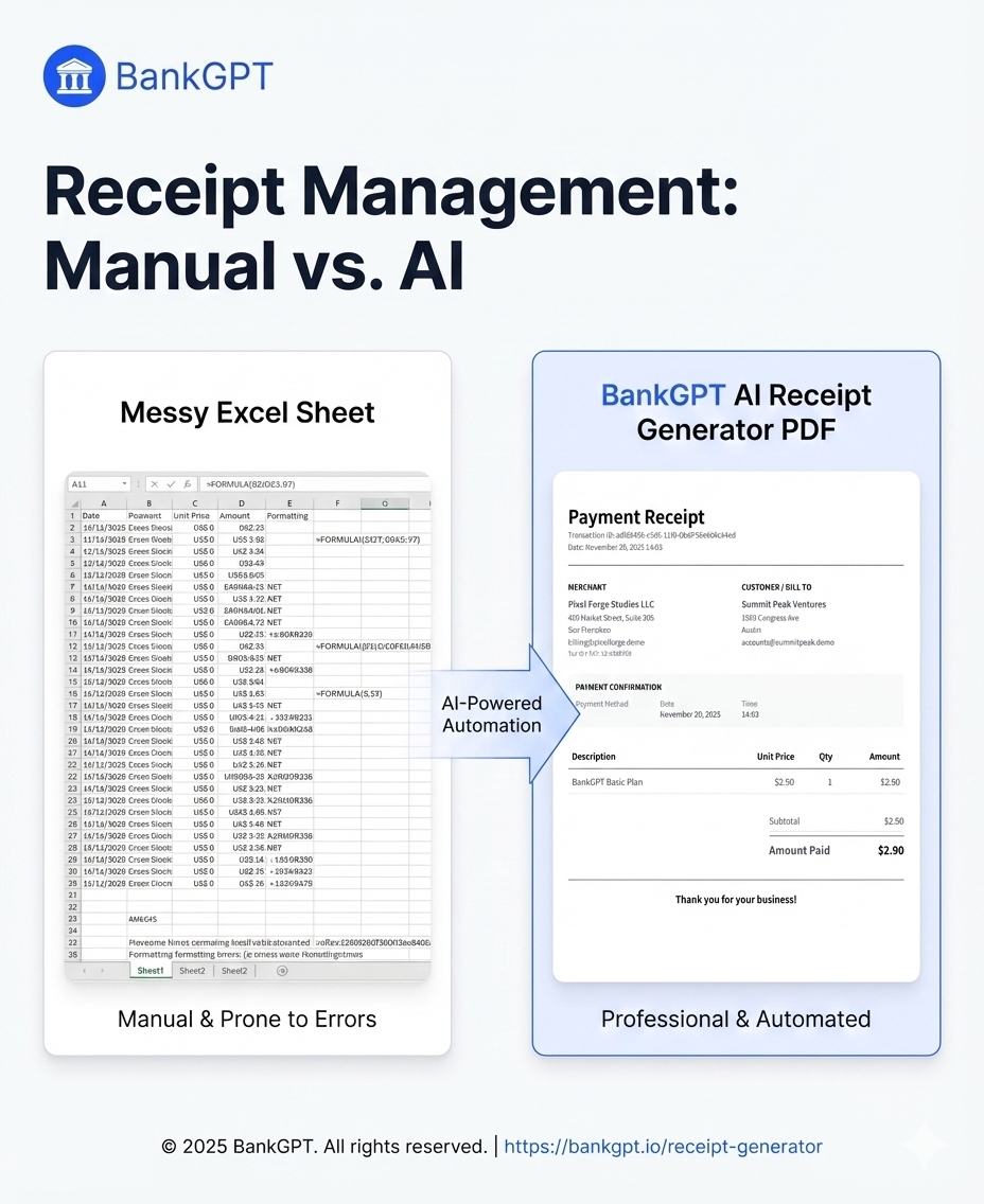 For decades, Excel was the default tool for creating financial documents. But let’s be honest: Excel is ugly, clunky, and prone to breaking. I recently compared the traditional spreadsheet method against the BankGPT AI Receipt Generator, and the results were clear. It is time to retire your spreadsheets.