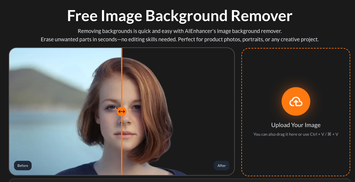 AIEnhancer makes background removal both simple and efficient. Instead of manually tracing edges or learning advanced editing steps, the tool handles everything automatically. Upload any image—product shots, portraits, graphics, or logos—and watch the background disappear in seconds. You don’t need editing experience, and you certainly don’t need expensive software. This free feature ensures smooth edges, clean cutouts, and ready-to-use transparent images for any project.