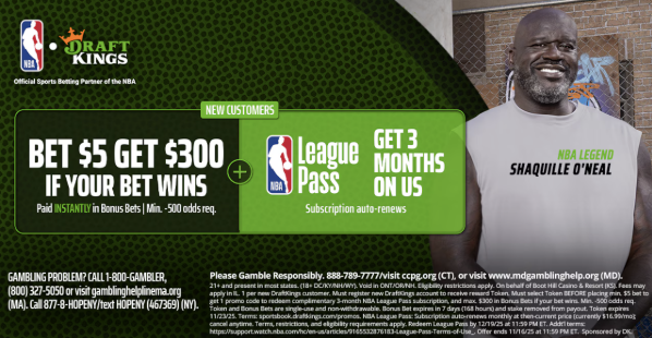The $300 bonus bet amount is not given as a lump sum amount. It is awarded in twelve $25 bonus bets, which can be used on any sport available on DraftKings. To further enhance the deal, users will also receive a three-month NBA League Pass subscription as part of the promotion.