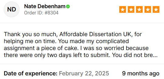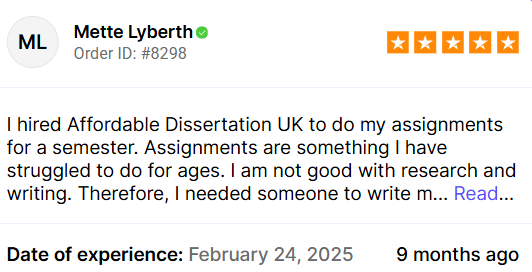 We verify the credibility of Affordable Dissertation UK by exploring the customer reviews on their official website. This trusted assignment writing service has thousands of verified testimonials with an impressive 4.9/5 satisfaction rating.