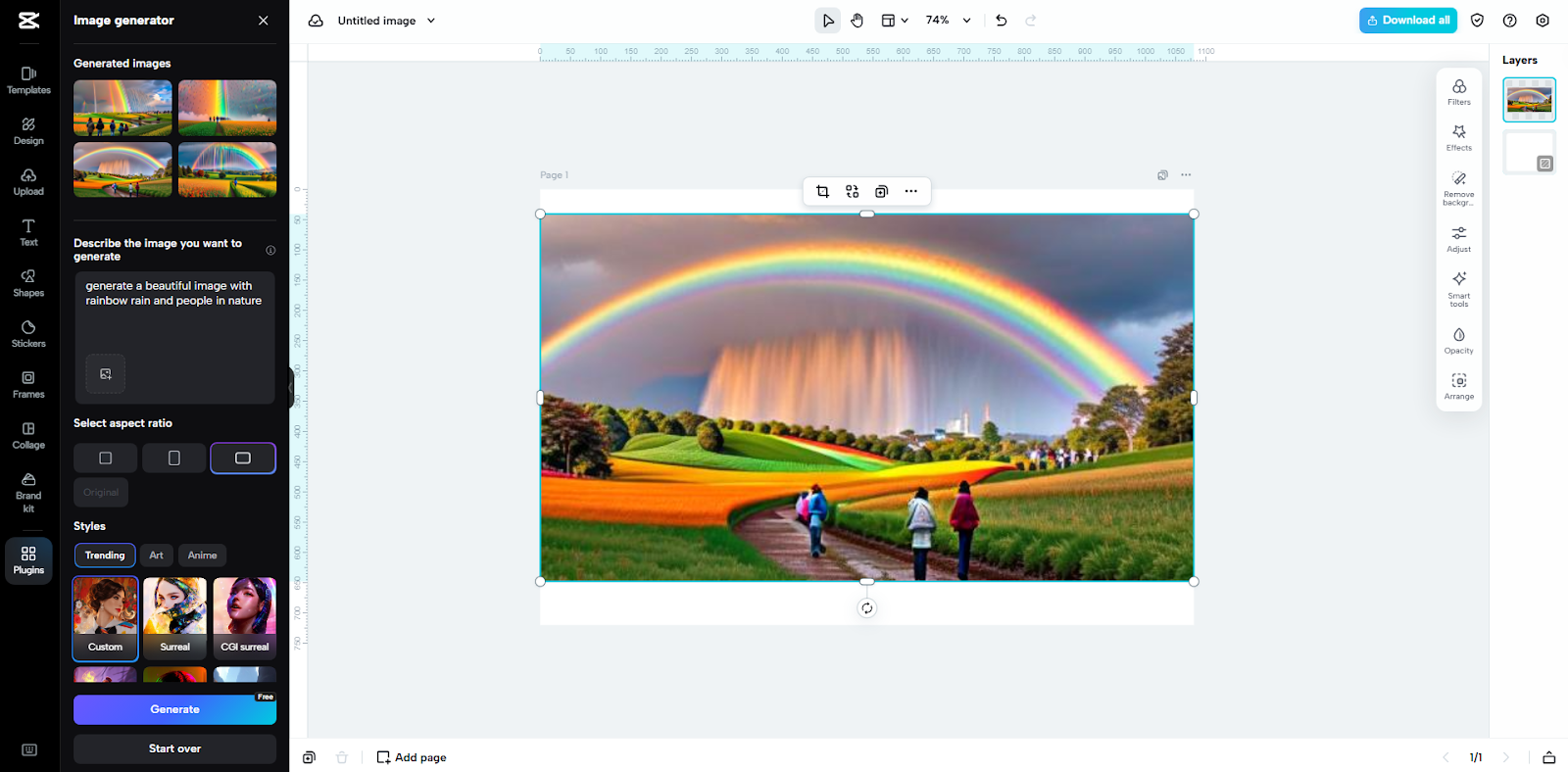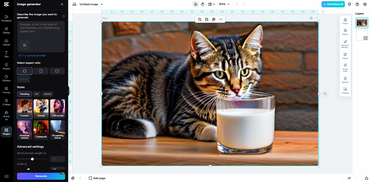 Write your prompt and then choose the aspect ratio and style that match your vision. In advanced settings, slide prompt weight and scale to control alignment. The higher the value, the closer your image sticks to your style and reference. Tap "Generate" to bring your styled visual to life. Afterward, apply filters, animations, and editing effects for deeper customization.