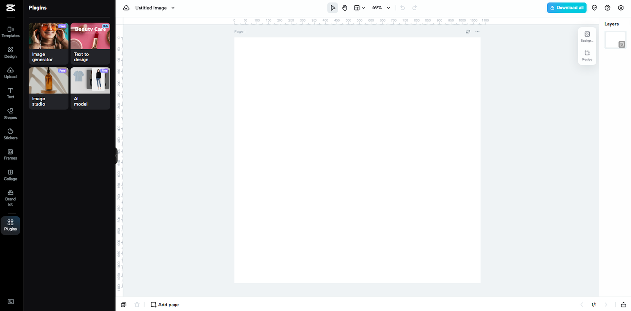 A pop-up gives you the choice of preset or custom sizes. Select "Plugins" on the left, then click "Image generator". Upload a style reference photo from your local device, Cloud, Google Drive, or Dropbox. If you prefer, skip uploading and generate images purely from your text prompt.